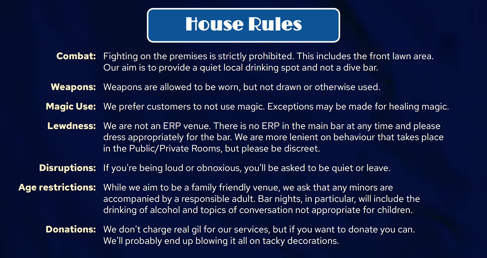 mooglesite.com (the "Site") is a Final Fantasy XIV fansite for entertainment purposes only. All information on the Site is provided in good faith, however we make no representation or warranty of any kind, express or implied, regarding the accuracy, adequacy, validity, reliability, availability or completeness of any information on the Site.